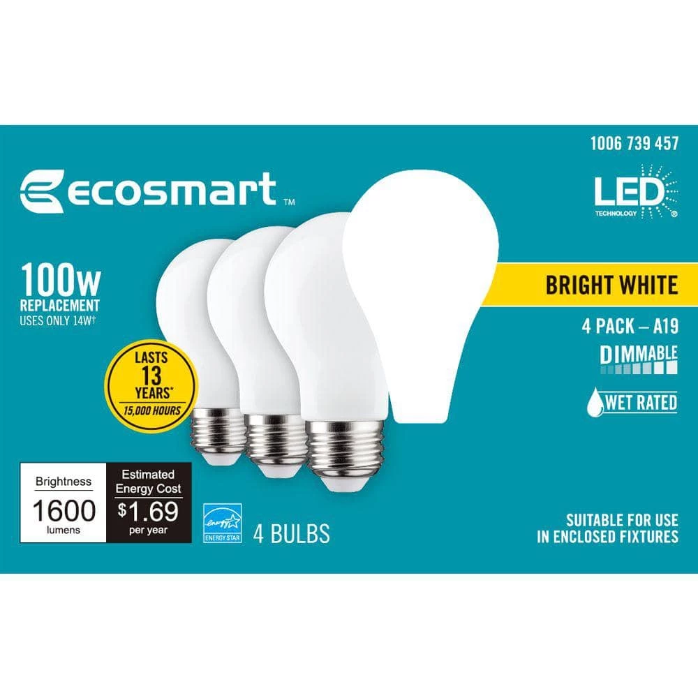 The EcoSmart A19 LED Filament Bulb 14-Watt (100-Watt) LED Light Bulb can be used to replace a 100-Watt bulb. The bright white LED light has a 14-Watt of power and puts out 1600 Lumens for up to 15,000 life hours. The energy-efficient LED bulbs offer you an estimated energy cost of $1.69 per bulb over the course of the bulb’s life.
