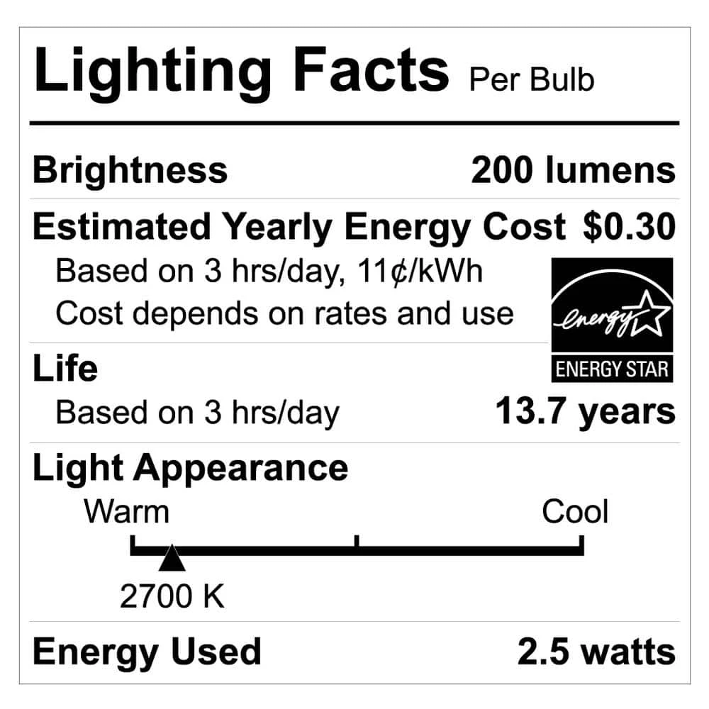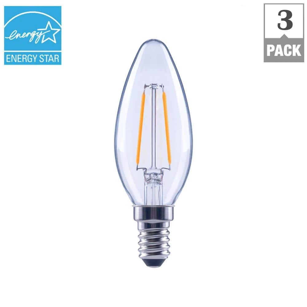 This 3-pack of 25-Watt Equivalent EcoSmart B11 candelabra base vintage filament LED light bulb is a stylish replacement for traditional incandescent bulbs – with all the benefits of LED technology. The color temperature of this light bulb is Soft White (2700K). These LED light bulbs are dimmable, have a clear all-glass exterior, and provides an omni-directional (360°) distribution of light. The EcoSmart LED 25-Watt equivalent decorative LED filament light bulb uses only 2.5-Watt of energy – that is a 90% savings over traditional lighting – and that means savings on your energy bill every month. These bulbs are rated for 90 CRI (color rendering index). The EcoSmart LED light bulbs are Indoor/Outdoor (wet rated) and able to be used in enclosed fixtures. The 15,000-hour lifespan and 5-year warranty makes these light bulbs a great choice for applications in your home and office. Start saving today with EcoSmart.