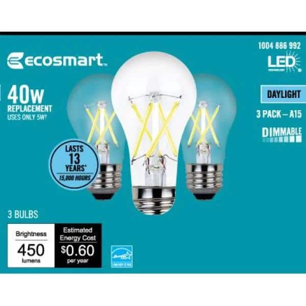 This 3-pack of 40-Watt Equivalent EcoSmart A15 medium base vintage filament LED light bulb is a stylish replacement for traditional incandescent bulbs – with all the benefits of LED technology. The color temperature of this light bulb is Daylight (5000K). These LED light bulbs are dimmable, have a clear all-glass exterior, and provides an omni-directional (360°) distribution of light. The EcoSmart LED 40-Watt equivalent decorative LED filament light bulb uses only 5-Watt of energy – that is a 87% savings over traditional lighting – and that means savings on your energy bill every month. These bulbs are rated for 90 CRI (color rendering index). The EcoSmart LED light bulbs are Indoor/Outdoor (wet rated) and able to be used in enclosed fixtures. The 15,000-hour lifespan and 5-year warranty makes these light bulbs a great choice for applications in your home and office. Start saving today with EcoSmart.