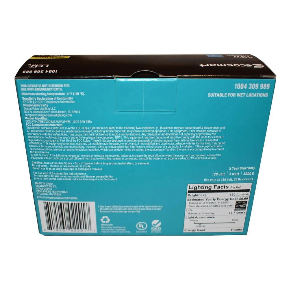 This 3-pack of 40-Watt Equivalent EcoSmart A15 medium base filament LED light bulb is a stylish replacement for traditional incandescent bulbs – with all the benefits of LED technology. The color temperature of this light bulb is Bright White (3000K). These LED light bulbs are dimmable, have a frosted all-glass exterior and provides an omni-directional (360°) distribution of light. The EcoSmart LED 40-Watt equivalent decorative LED filament light bulb uses only 5.5-Watt of energy – that is an 86% savings over traditional lighting – and that means savings on your energy bill every month. The 15,000-hour lifespan and 5-year warranty makes these light bulbs a great choice for applications in your home and office. Start saving today with EcoSmart.