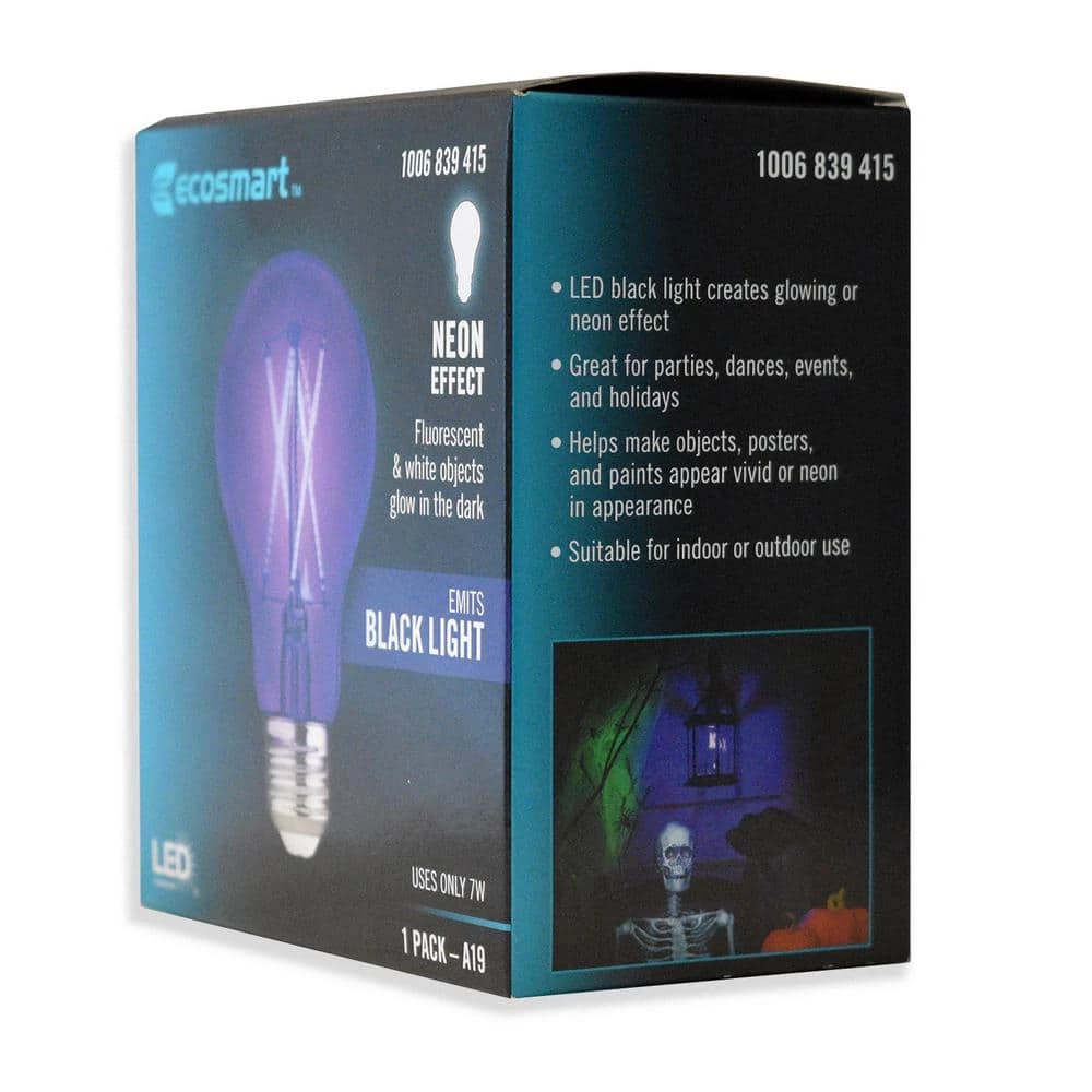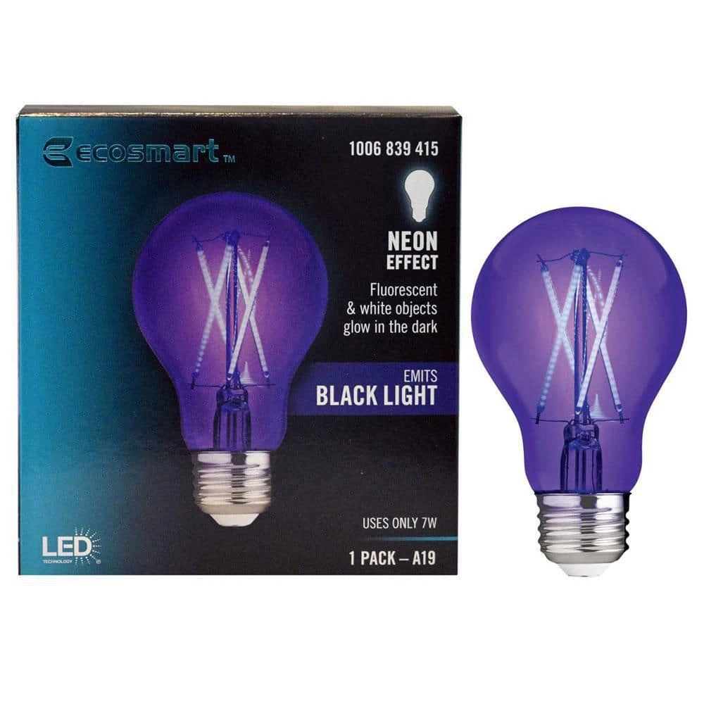 The Ecosmart 40-Watt Equivalent A19 Black Light E26 Medium base LED light bulb is a stylish replacement for traditional incandescent bulbs with all the benefits of LED technology. This blacklight is a great way to create a glow-in-the-dark effect in any space. These LED light bulbs are non-dimmable and provide an omni-directional 360° distribution of light. The EcoSmart LED 40-Watt equivalent LED Black Light bulb uses only 7-Watt of energy that is an 82% savings over traditional lighting and that means savings on your energy bill every-month. The 11000 hour lifespan and 5-year warranty makes these light bulbs a great choice for applications in your home and office. Start saving today with EcoSmart.