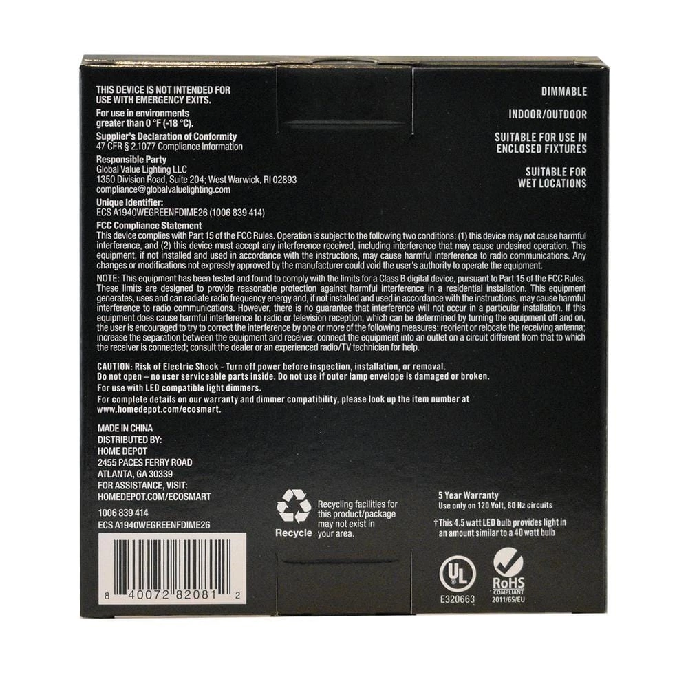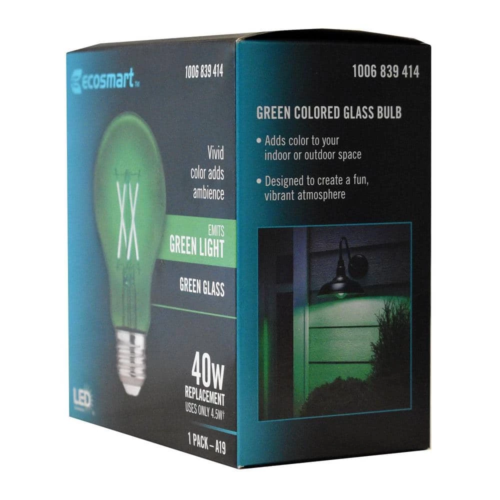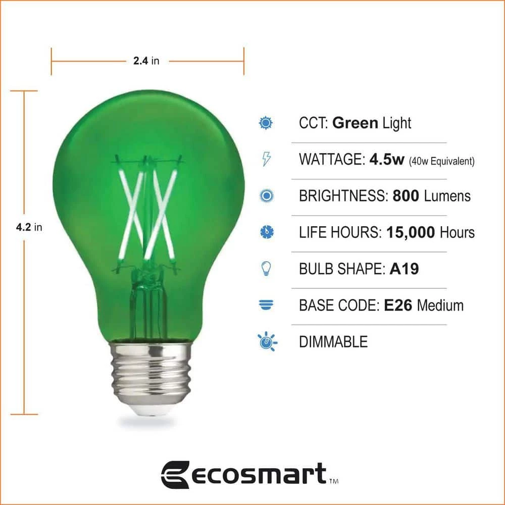 The EcoSmart 40-Watt Equivalent A19 Dimmable Filament Green Colored Glass LED Light Bulb is a stylish direct replacement for traditional incandescent bulbs with all the benefits of LED technology. The bulb emits a vibrant green light, making it the perfect way to add a pop of color to any room. These LED light bulbs are dimmable and provide an omni-directional 360° distribution of light. The EcoSmart 40-Watt Equivalent A19 Dimmable Filament Green Colored Glass LED Light Bulb uses only 4.5 watts of energy that is an 88% savings over traditional lighting and that means savings on your energy bill every month. The 25000 hour lifespan and 5-year warranty makes these light bulbs a great choice for applications in your home and office. Start saving today with EcoSmart.