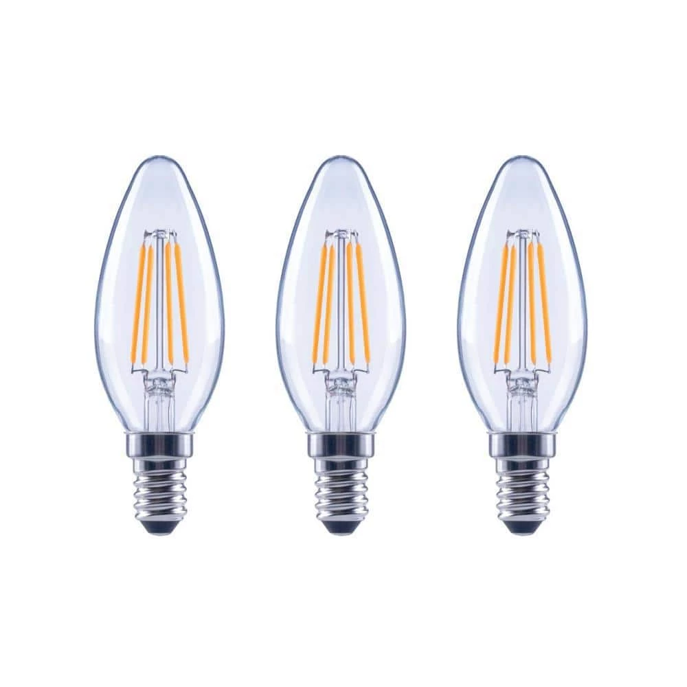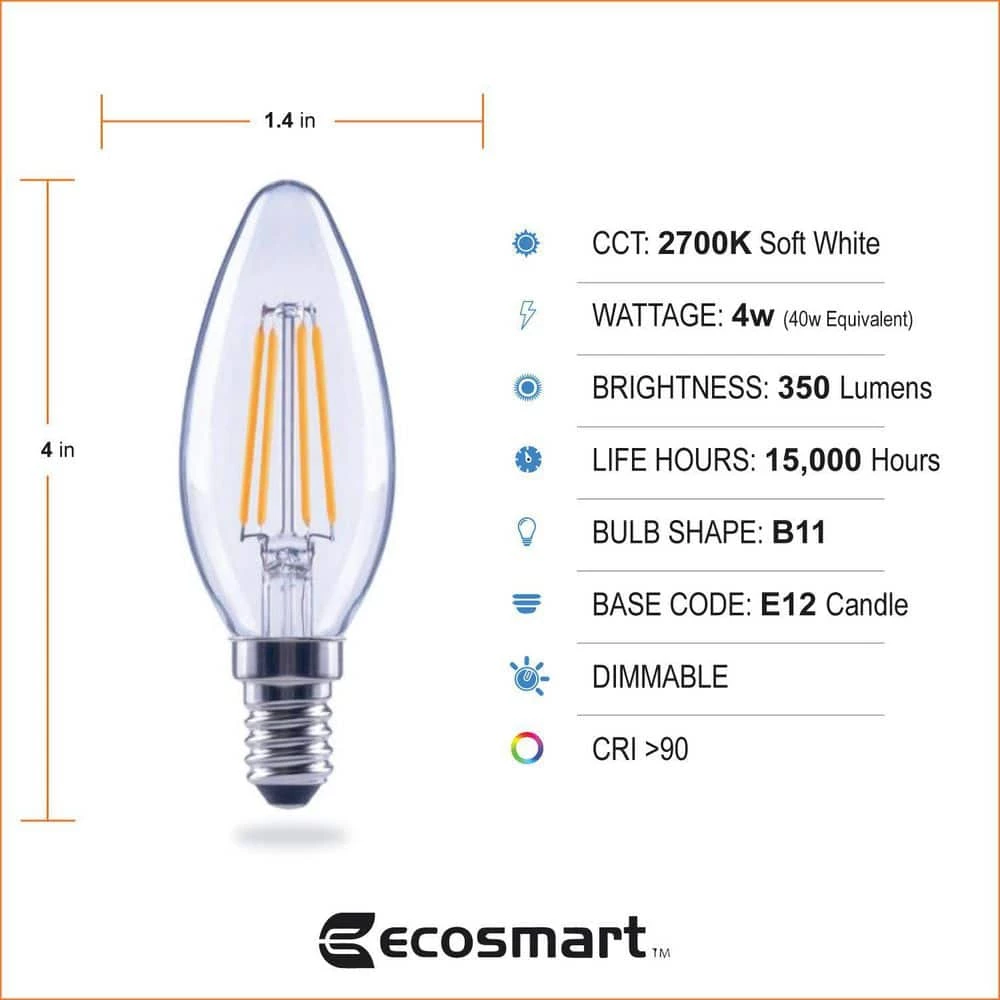 The 40-Watt Equivalent EcoSmart B11 candelabra base vintage filament LED light bulb is a stylish replacement for traditional incandescent bulbs – with all the benefits of LED technology. These LED light bulbs are dimmable, have a clear all-glass exterior, and provide an omni-directional (360°) distribution of light. Save on your energy bill every month! The energy efficient EcoSmart 40-Watt equivalent decorative LED filament light bulb offers a 90% savings over traditional lighting by using only 4-Watts of energy. This bulb emits 2700K (Soft White) color temperature, which is essential in creating a relaxing, balanced feel throughout your home. It is recommended for living rooms, kitchens, bathrooms, and bedrooms. Customize your lighting style with this dimmable bulb by adjusting your light from soft white to a relaxing, low light. These EcoSmart LED light bulbs are Indoor/Outdoor (wet rated) and are able to be used in enclosed fixtures. They are also rated for 90 CRI (color rendering index). The 15,000-hour lifespan and 5-year warranty makes these light bulbs a great choice for applications in your home and office. Start saving today with EcoSmart.