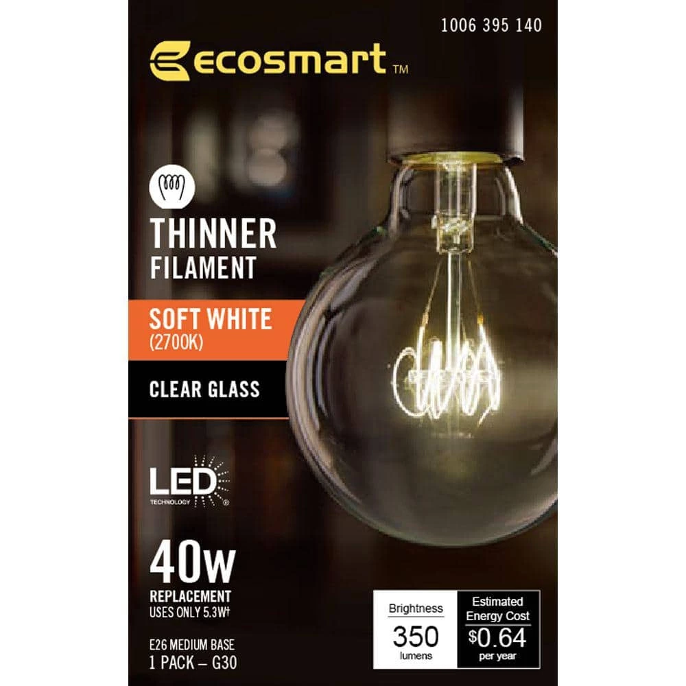 Enhance your home with the EcoSmart G30 LED Vintage Edison Filament Bulb. This bulb can be used to replace a 40-Watt bulb. The Soft White LED light has 5.3-Watt of power and emits 350 Lumens for up to 15,000 life hours. The soft white color temperature is essential for creating a relaxing, balanced feel throughout your home. It is recommended for living rooms, kitchens, bathrooms and bedrooms. Customize your lighting style with this dimmable bulb, by adjusting your light from soft white to a relaxing low, light. The decorative G30 bulb is designed for indoor or outdoor fixtures and features a medium E26 base. The energy-efficient LED bulbs offer you an estimated energy cost of $0.64 per bulb over the course of the bulb’s life. Create a unique style in your living space with this Vintage Edison LED bulb today.