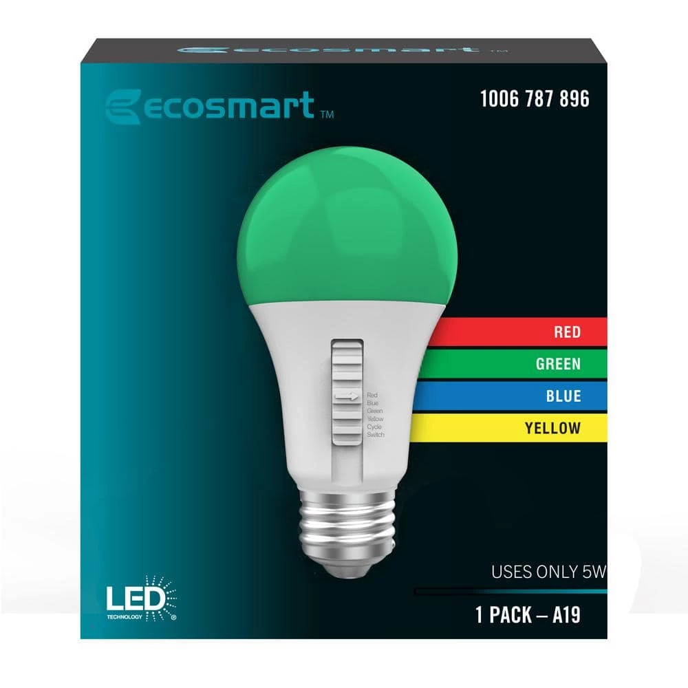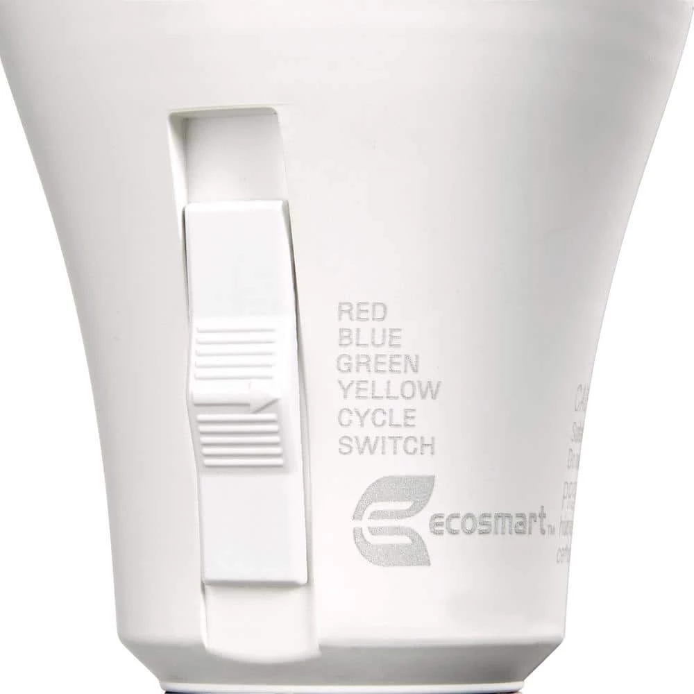 Get the right lighting to make any celebration or holiday come to life with the Ecosmart color changing A19 LED Party Bulb. It makes any celebration more festive with red, green, blue, yellow light and gives 5 light effect options to choose from. Easily switch between colors using the toggle on each unit or set to switch and conveniently cycle between colors with a simple flip of a standard wall switch. It’s multiple light colors and effects make them the perfect bulb to set a fun and festive mood at parties, or to use as home decor during the holidays. Just install them in any fixture with an E26 base socket, it’s that simple! This LED party bulb uses only 5 watts and has a long life of 15,000 Hours making them the go-to decor piece for any occasion.