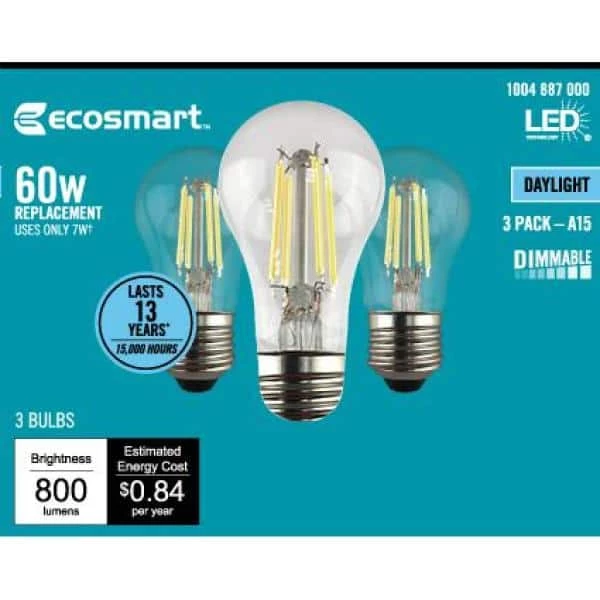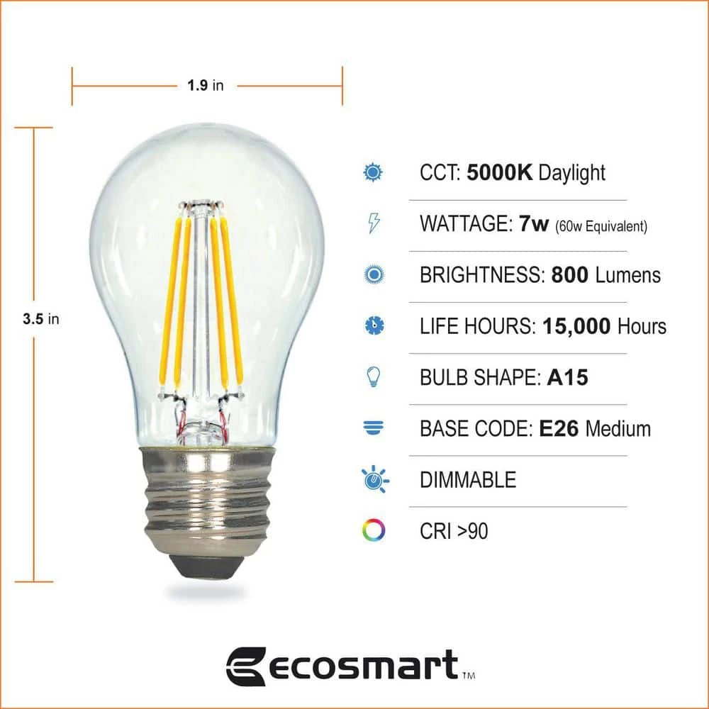 The 60-Watt Equivalent EcoSmart A15 medium base vintage filament LED light bulb is a stylish replacement for traditional incandescent bulbs – with all the benefits of LED technology. These LED light bulbs are dimmable, have a clear all-glass exterior, and provide an omni-directional (360°) distribution of light. Save on your energy bill every month! The energy efficient EcoSmart 60-Watt equivalent decorative LED filament light bulb offers an 88% savings over traditional lighting by using only 7-Watts of energy. This bulb emits 5000K (Daylight) color temperature, which is essential for creating a bright, crisp feel throughout your home. It is recommended for living rooms, kitchens, bathrooms, and bedrooms. Customize your lighting style with this dimmable bulb by adjusting your light from daylight to a relaxing, low light. These EcoSmart LED light bulbs are Indoor/Outdoor (wet rated) and are able to be used in enclosed fixtures. They are also rated for 90 CRI (color rendering index). The 15,000-hour lifespan and 5-year warranty makes these light bulbs a great choice for applications in your home and office. Start saving today with EcoSmart.
