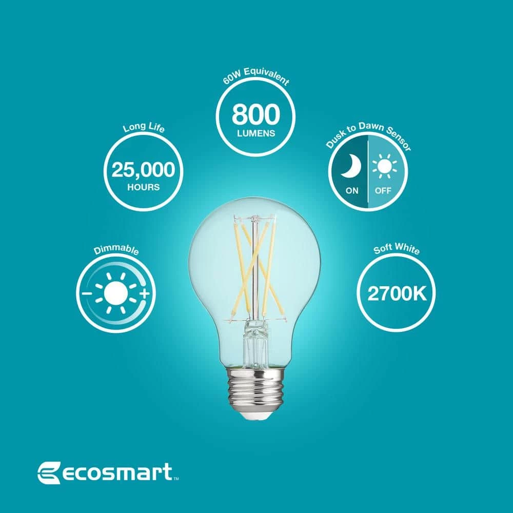 Turn any fixture into a dusk to dawn fixture with the Ecosmart A19 LED light bulb with built in light detecting sensor. The sensor inside this A19 LED light bulb will automatically turn the bulb on at dusk and off at dawn. This LED bulb is reccomended for any area of your home where automatic on/off light may be needed, such as entry ways, porches, garages and utility rooms. Designed to mimic the look of the traditional incandescent light bulbs, these A19 LED light bulbs feature an A-line shape and medium (E26) base. Using only 8-watts of energy, these A19 LED bulbs emit 800 lumens of brightness, equivalent to a traditional 60-Watt incandescent light bulb. Soft White (2700K) color temperature provides a warm, inviting white light. 10 year warranty. Light. Your Way.