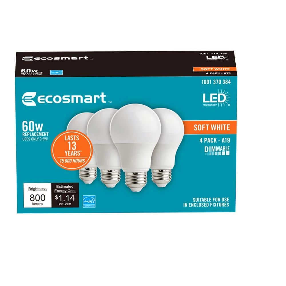 These fully dimmable, ENERGY STAR rated, A19 LED light bulbs use only 9.5-Watt of energy but provide brightness (800 Lumens) similar to a 60-Watt incandescent light bulb. The reduction in energy translates to saving dollars and cents on your power bill for years to come. These bulbs are estimated to cost $1.14 per year to operate. When compared to a traditional 60-Watt incandescent light bulb, these bulbs are estimated to save you up to $83 in energy costs over the course of the bulbs 15,000 hour lifetime. These 60-Watt equivalent A19 LED bulbs are dimmable as well as omni-directional. They emit 2700K (Soft White) color temperature, which is recommended for any room in your home where you desire warm and inviting light. Suitable for use in totally enclosed fixtures. ENERGY STAR rated. 5 year warranty.