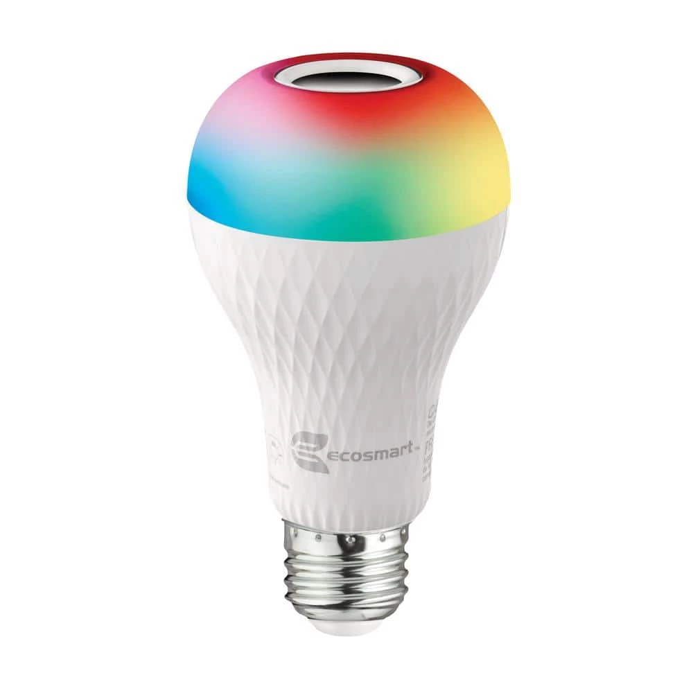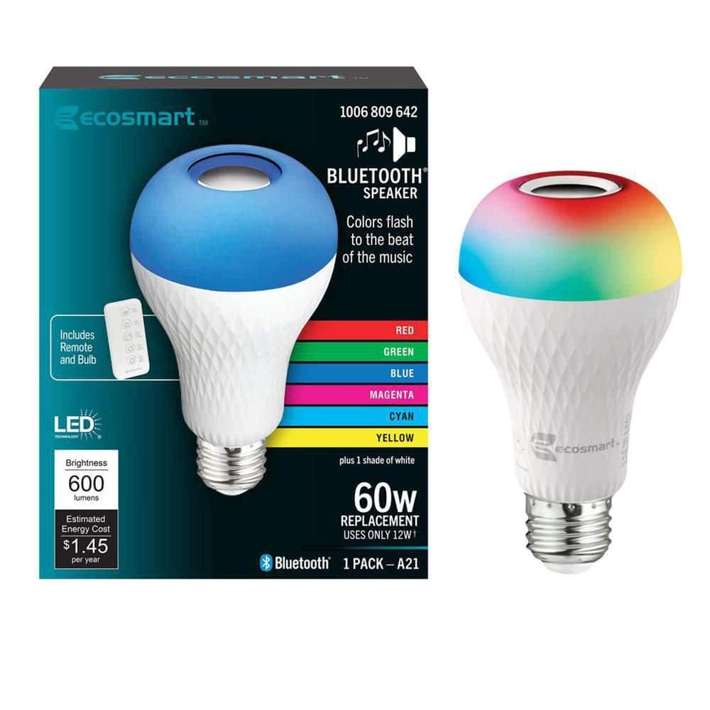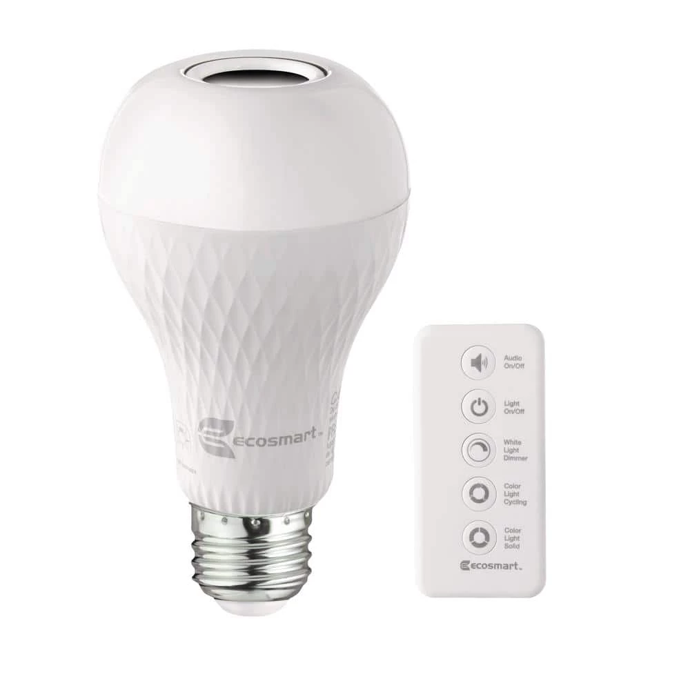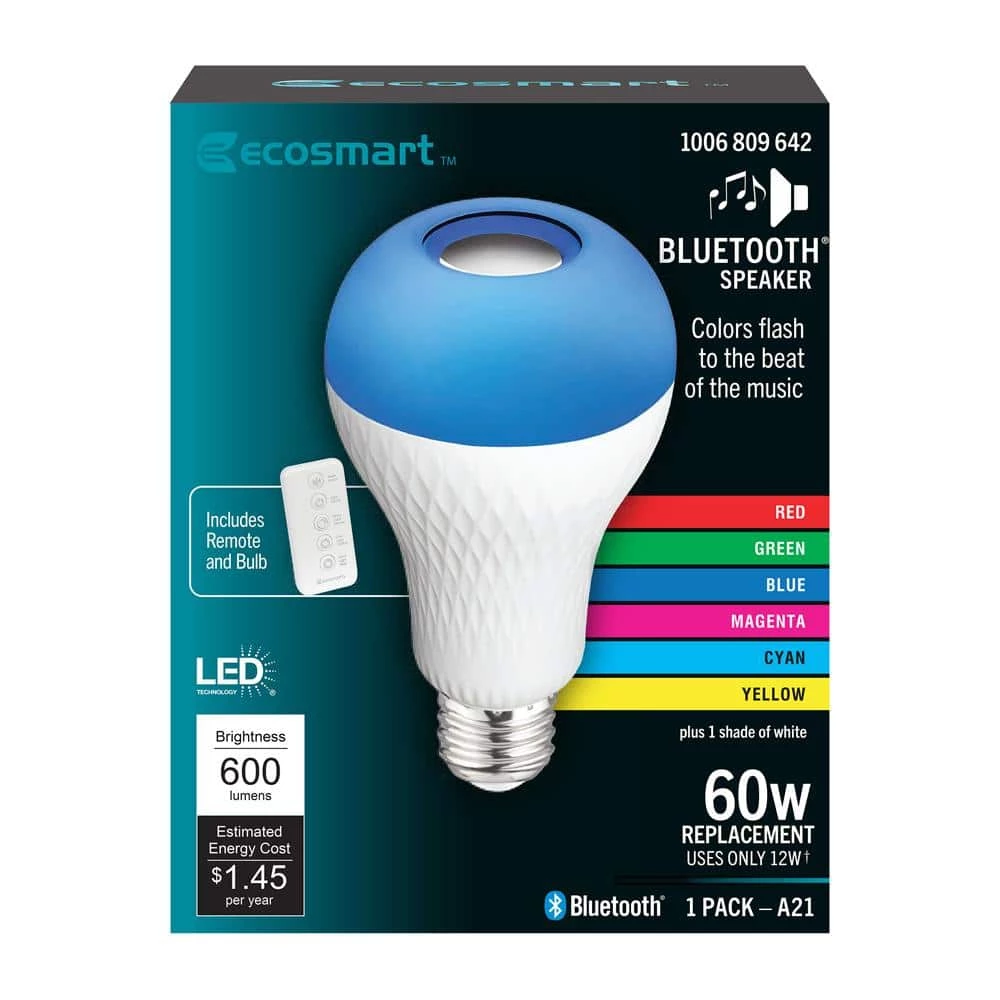 Ecosmart A21 LED Bluetooth speaker bulbs combine lighting with Bluetooth technology. Its integrated Bluetooth speaker plays your favorite tunes by simply connecting to your favorite Bluetooth device without the need for extra wiring or a hub. Use as a standard E26 LED bulb to light up your space and enjoy the soft glow of 3000K white light. For a unique effect, choose individual red, green, or blue color or fade RGB. Add a fun and unique atmosphere to any celebration by matching your lighting to the beat of your music. Simply choose your favorite song and your bulb will flash to the beat of any song. This bulb is equipped with a remote for added convenience that allows you to switch between dimming white light, solid and fade through color effects. There is no need to uninstall the bulb to turn on or off, it’s remote allows you to easily turn Bluetooth audio and light on and off with the press of a button. This unique bulb emits 700 Lumens of white light and uses 9 Watts and is versatile making it ideal for use in a variety of fixtures and lighting applications.