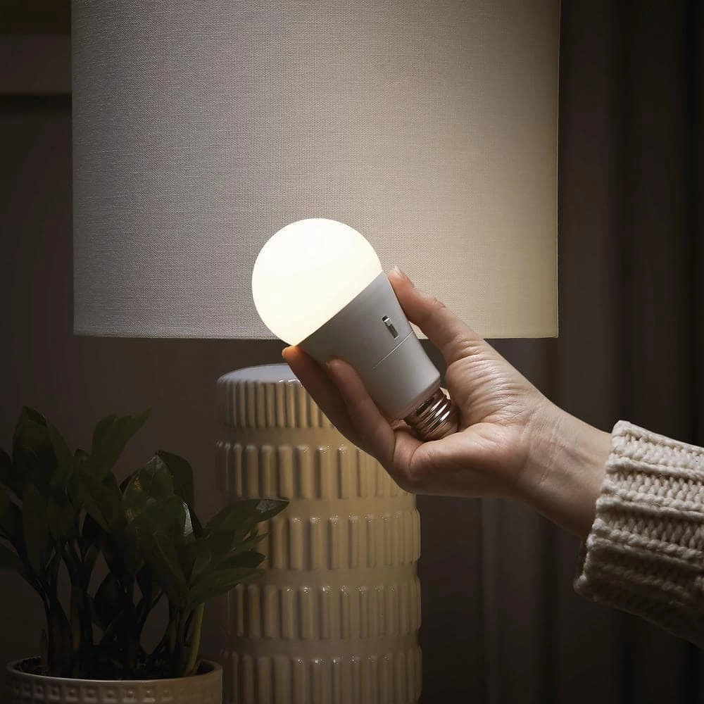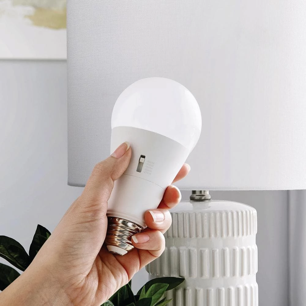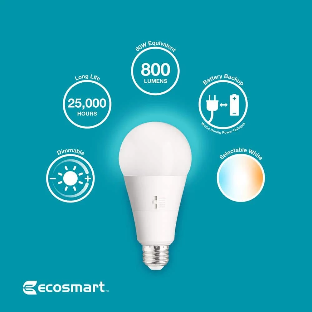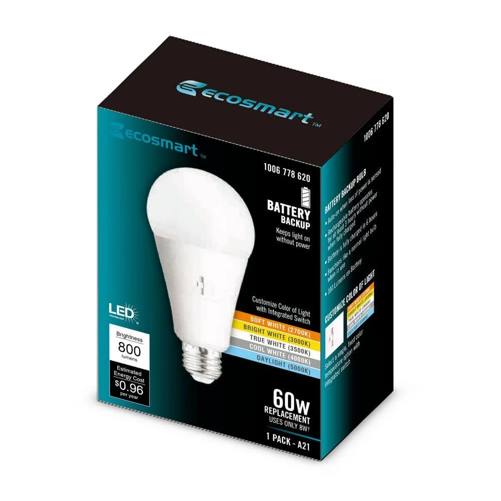 This energy efficient Ecosmart LED light bulb is equipped with a power failure battery that will automatically illuminate the LED bulb if the power fails. In this sense, this LED light bulb can function as a flash light in the event the power goes out. When in regular use, the battery will be charging, ensuring you will always have an option for light in the event of a sudden power outage. The battery works for 3 hours when not connected to power. Using only 8-watts of energy, this LED bulb produces 800 lumens (equivalent to a 60W incandescent bulb). Equipped with an integrated swith that allows you to select your preferred color temperature from Soft White (2700K), Bright White (3000K), True White (3500K), Cool White (4000K) and Daylight (5000K) and dimmable down to 3%, this LED bulb is suitable for any room in your home. Not suitable for use in enclosed fixtures. 10 year warranty. Start saving today with EcoSmart. Light. Your Way.