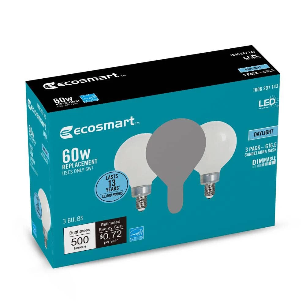 The 60-Watt Equivalent EcoSmart G16.5, E12 base filament LED light bulb is a stylish replacement for traditional incandescent bulbs – with all the benefits of LED technology. Save on your energy bill every month. The energy efficient EcoSmart 60-Watt equivalent decorative LED filament light bulb offers you an estimated energy cost of $0.72 per bulb over the course of the bulb’s life by using only 6-Watt of energy. This bulb emits 500 Lumens of 5000K (Daylight) color temperature, which is essential for creating a bright, crisp feel throughout your home. It is recommended for living rooms, kitchens, bathrooms and bedrooms. Customize your lighting style with this dimmable bulb by adjusting your light from daylight to a relaxing, low light. The 15,000-hour lifespan makes these light bulbs a great choice for applications in your home and office. Start saving today with EcoSmart. California Energy Commission Title 20 compliant LED light bulb