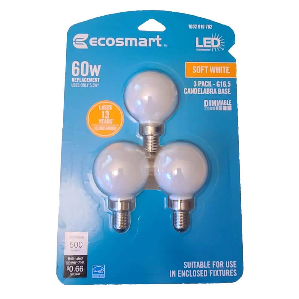 This 3-pack of 60W Equivalent EcoSmart G16.5 candelabra base filament LED light bulb is a stylish replacement for traditional incandescent bulbs – with all the benefits of LED technology. The color temperature of this light bulb is Soft White (2700K). These LED light bulbs are dimmable, have a frosted all-glass exterior, and provides an omni-directional (360°) distribution of light. The EcoSmart LED 60W equivalent decorative LED filament light bulb uses only 5.5-Watt of energy – that is a 91% savings over traditional lighting – and that means savings on your energy bill every month. The 15,000-hour lifespan and 5 year warranty makes these light bulbs a great choice for applications in your home and office. Start saving today with EcoSmart.