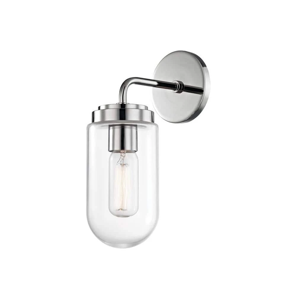 An incandescent bulb is on display inside a glass jar shade in this chic piece. Metal accents at the bulb base, arm, canopy and backplate add a touch of shine. Bath and vanity fixtures feature a beehive-inspired, ribbed glass shade.