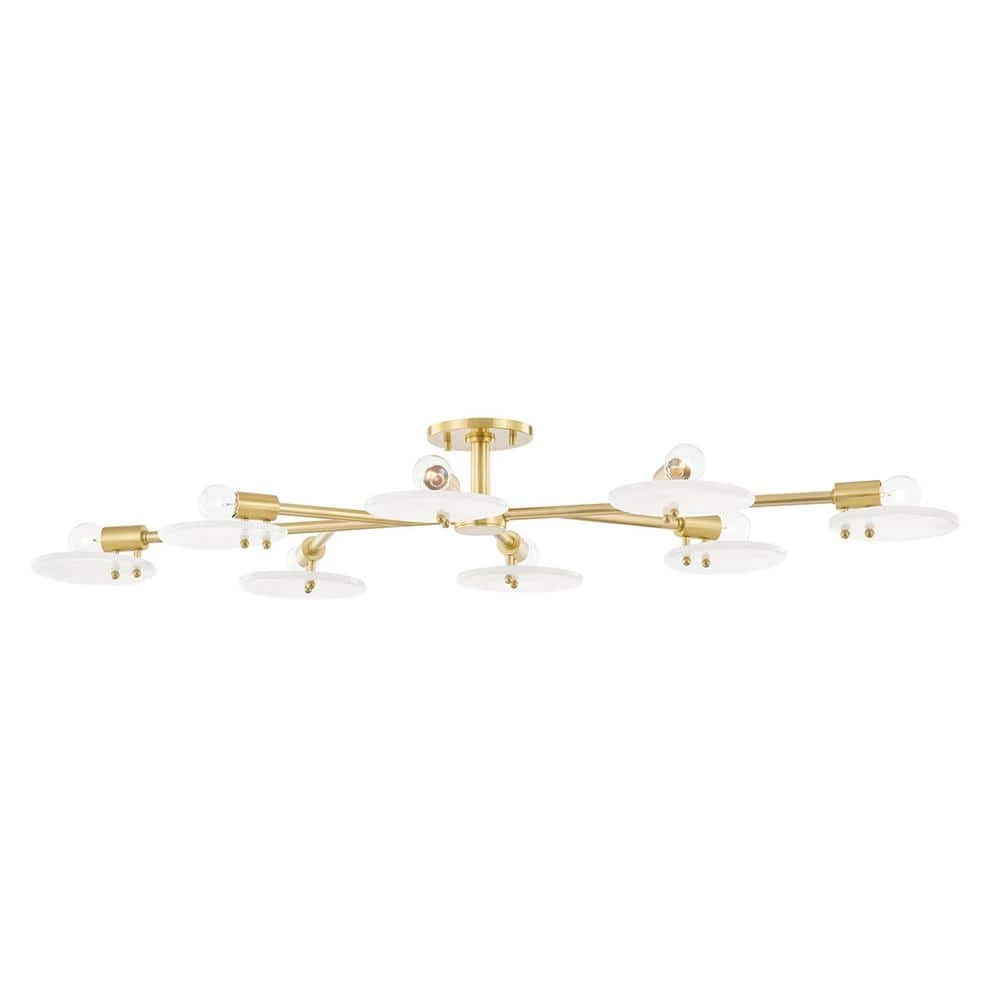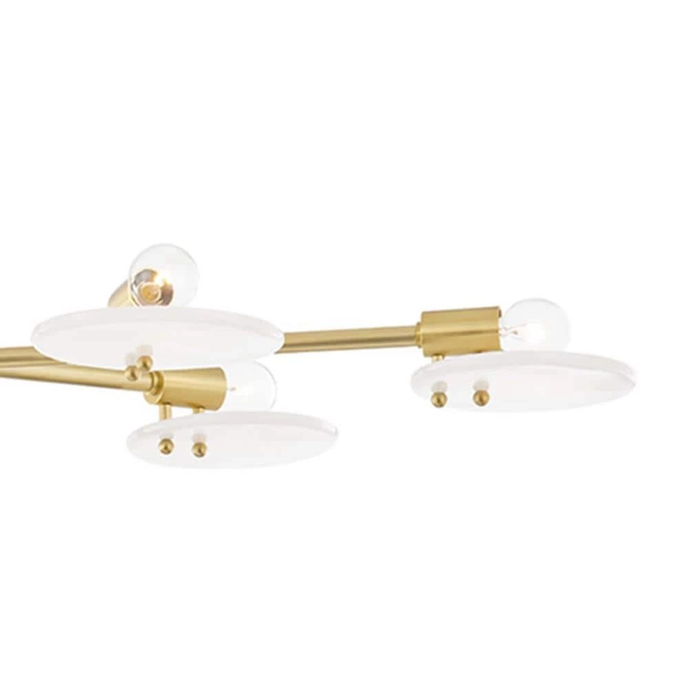Light shines from behind shades made of white candy glass in this sweet fixture. The disc-shaped shades sprout from metal arms, giving the 4-light sconce and 8-light flush mount a sprawling, sophisticated feel. Available in Aged Brass, Polished Nickel or Old Bronze.
