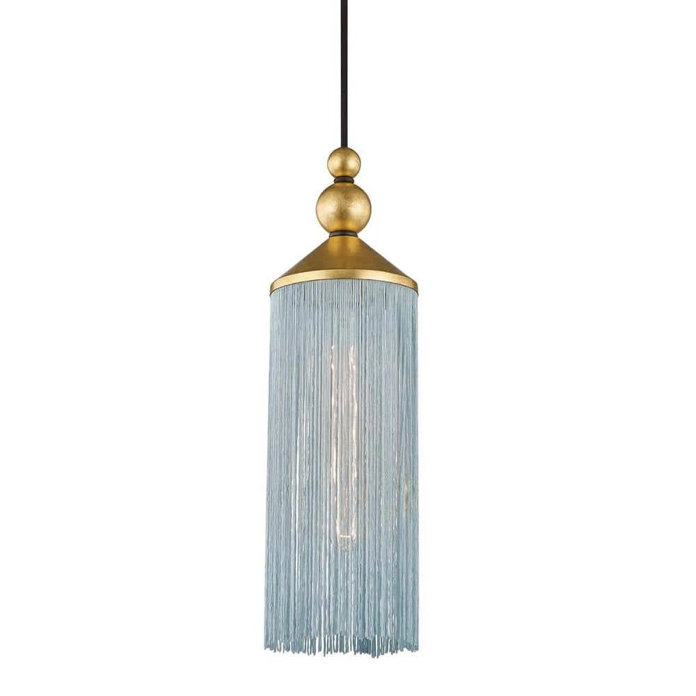 Scarlett obscures its bulb with flapper-like fringe in fun colors, making it a boho chic shoe-in. Gold leaf ups the glamour and its black woven cord make it a very neat pendant. Hang one alone or suspend them in clusters-make your bohemian dreams come true. Includes one 75-Watt E26 medium base T10 bulb.